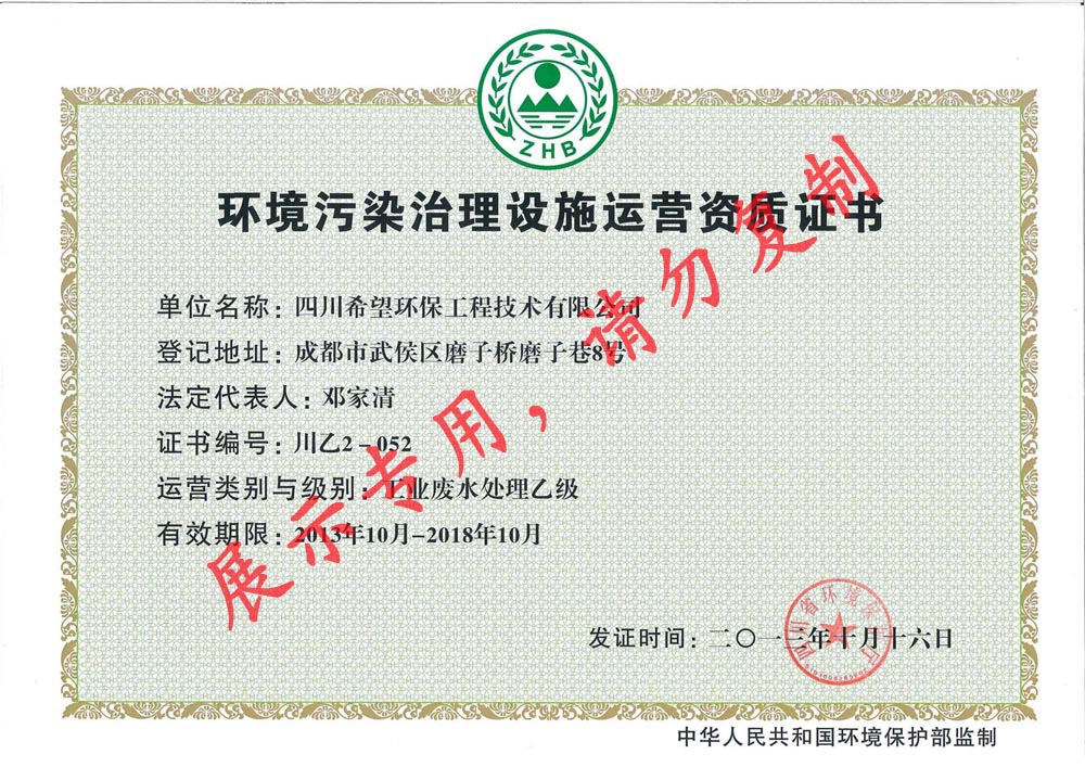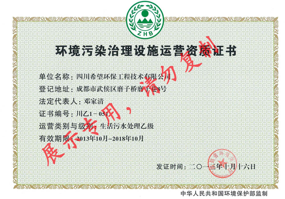 環(huán)境污染治理設(shè)施運(yùn)營證書(工業(yè)和生活污水)